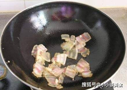 漂白後,將培根取出,用冷水沖洗並切成片。倒掉水,放入鍋中稍微煎一下。由於臘肉脂肪較多,所以一定要油炸,才能把臘肉的脂肪曬幹。如果全是瘦肉,就不用碰瞭。加少許油炒香,然後加入青蒜中的蒜蛋白,最後加入蒜葉,因為蒜葉容易熟。