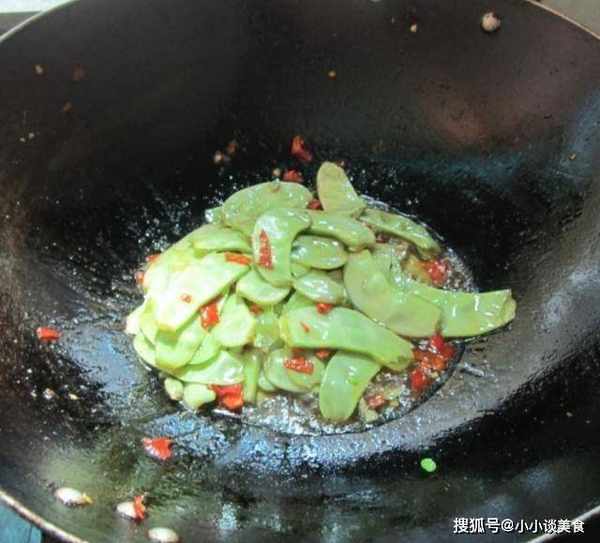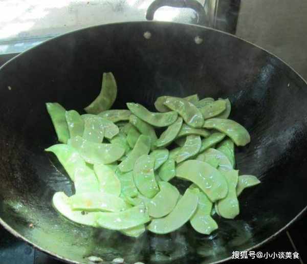 第三步:所有的材料都處理好後,把鍋燒熱。鍋熱後,將扁豆放入鍋中翻炒。扁豆烤軟後,可以在鍋裡加少許鹽。此時用鹽炒的扁豆會更容易入味,口感也更幹爽。