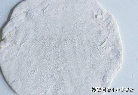 第四步,再撒些幹面粉,在切好的一面卷起,捏住封閉的一端,排成一團,用手掌壓扁,輕輕搟成餅狀。再次滾動胚胎;