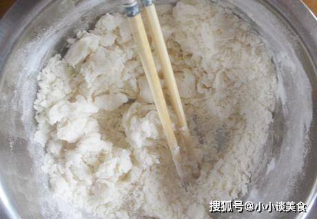 第一步,把面粉放在一個大碗裡,倒入開水,用筷子攪拌成糊狀,再倒入冷水,用手揉成面團,蓋上保鮮膜松開;