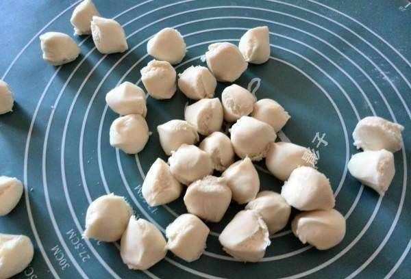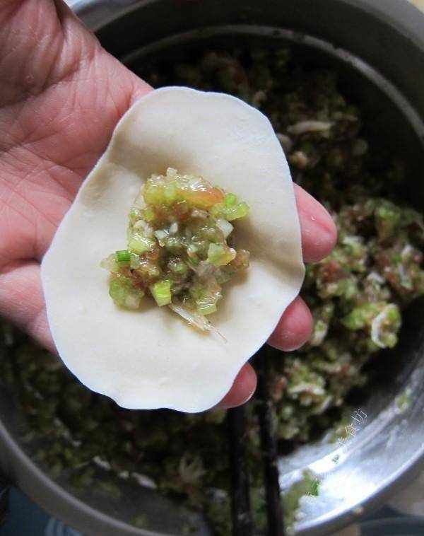 4、將面團揉成長條,分成大小一樣的塊,開始搟餃子皮。加入適量,填滿餃子皮。