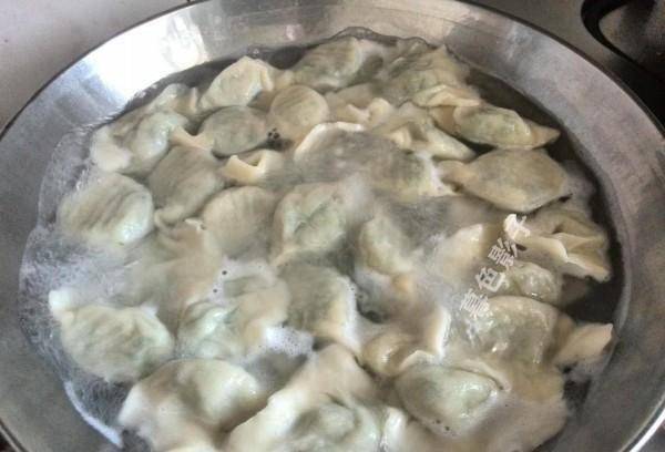 7、鍋裡放水煮餃子,輕輕攪拌,餃子可以翻過來,蓋上鍋蓋煮,餃子煮五分鐘就熟瞭。
