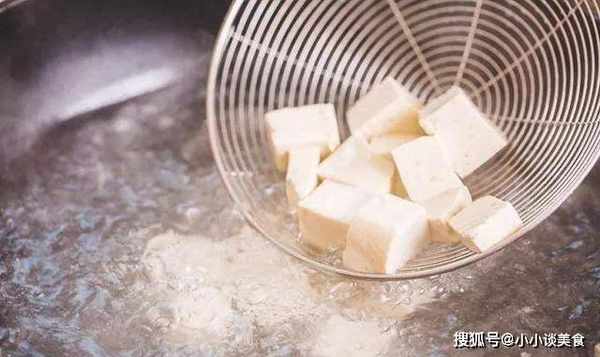 2、鍋中加入適量的水,大火燒開,放入切碎的軟豆腐,然後用水焯一下,撈出瀝幹多餘的水備用;