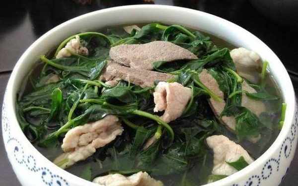 首先,我們準備適量的枸杞葉。洗凈後,用淡鹽水浸泡約半小時,烹調前沖洗幹凈,瀝幹水分備用。然後在早上準備豬三鮮,即鮮豬肉腸、豬肝和瘦肉。清洗後,將它們浸入冷水中以去除內部的污垢和血腥泡沫。準備生薑適量,洗凈切片備用。
