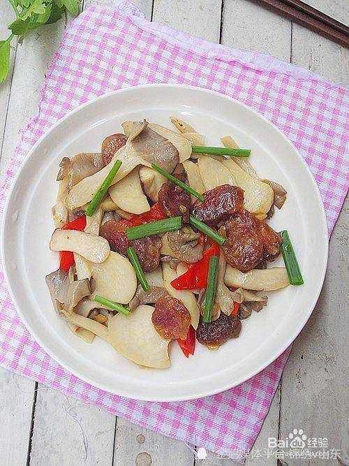 材料:平菇 、杏鮑菇 、臘腸 、青紅椒 、食用油 、雞精、鹽、蒜 、蠔油、生抽