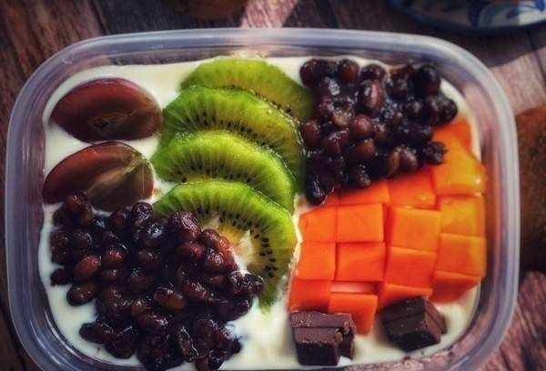 然後把準備好的酸奶倒在水果上,讓酸奶順著水果自然流到碗裡,再均勻的抹在水果表面,再倒入碗裡。然後蓋上一層保鮮膜,放入冰箱冷藏一會再吃。如果酸奶和水果之前冷凍過,可以立即食用。吃的時候可以點綴一些草莓或者檸檬,會更美味更漂亮!