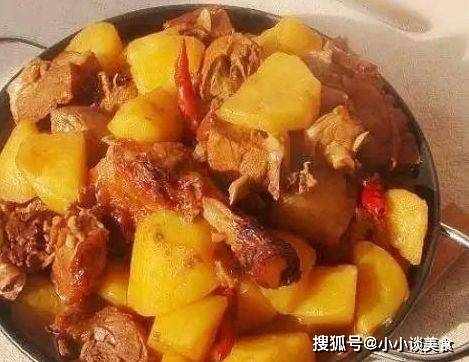 1.土豆去皮洗凈切塊,鴨肉再切成小塊。鍋內倒油後,下蔥、薑、紅辣椒、八角炒香,下鴨塊。