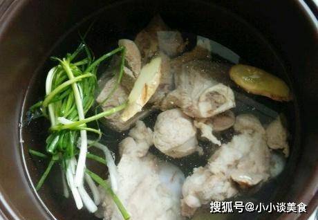 第三步是一片可以用刀切成片的生薑。將大蔥撈起洗凈,打成一個結。鍋內再次倒入清水,加足量的水,將醃制好的骨頭和薑、蔥一起開始煮;