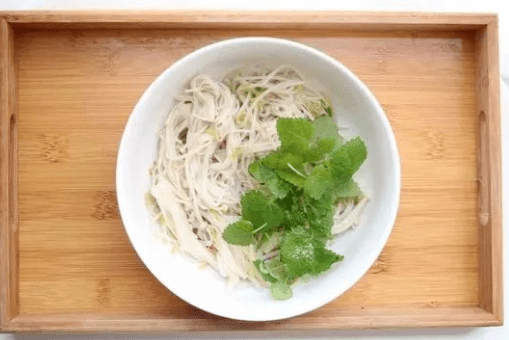 10.把燙熟的金針菇與豆芽鋪在碗底,放上檸檬薄荷。