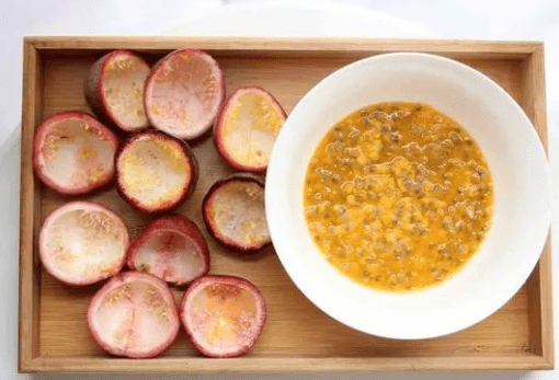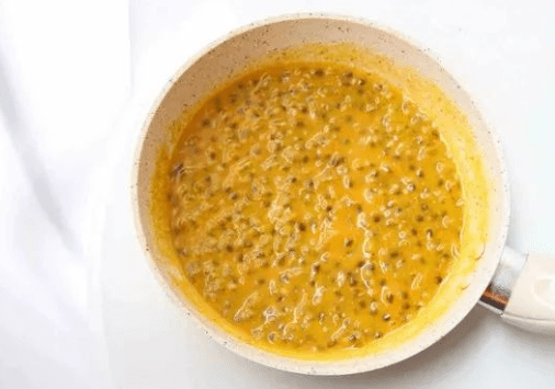 6.鍋裡倒入油燒熱,倒入百香果炒至金黃。