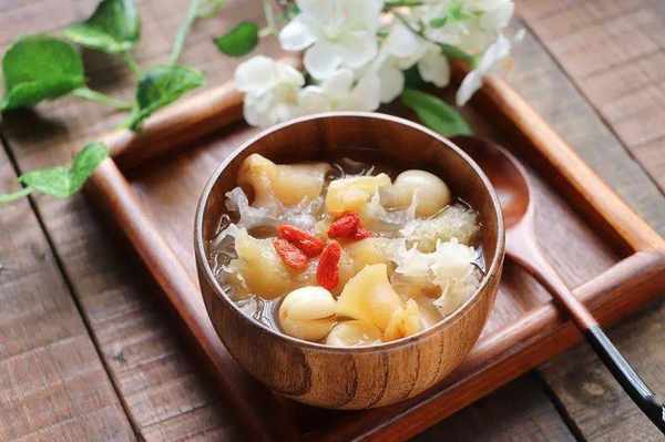 金桔雪梨銀耳羹,既可以預防感冒咳嗽,又可以美容養顏。金桔性溫、味辛甘酸,具有行氣解鬱、生津消食、止咳化痰的功效,銀耳紅棗可以潤肺養顏,提高免疫力,日常來一杯太合適了!