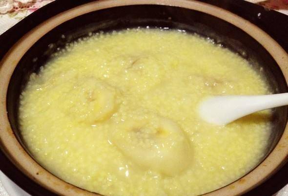 4.小米煮至濃稠後,倒入香蕉煮5分鐘。