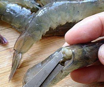 先用剪刀把蝦頭剪成45度角,然後去掉黑腦和紅血,然後把主蝦清洗幹凈。清洗時保持蝦黃色。蝦腦的位置是黃蝦的前端,所以摘蝦腦的時候要小心,以免蝦的黃色掉瞭。蝦腦附在蝦片上,蝦腦和蝦片可以一起選。