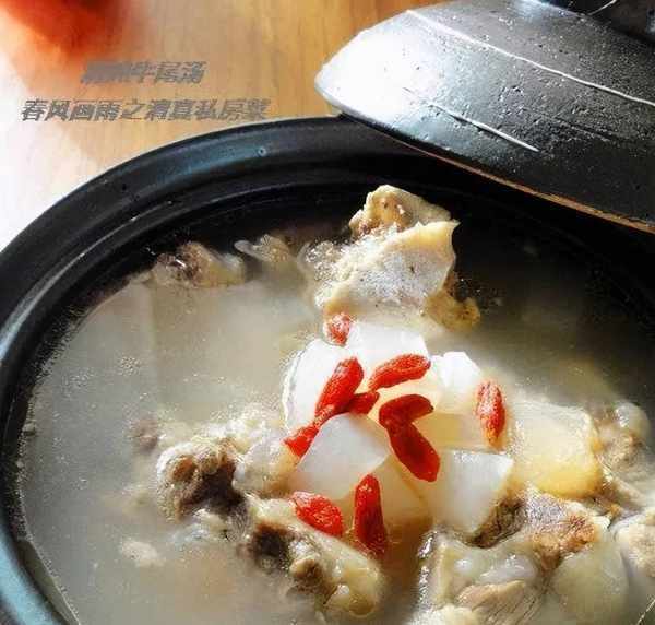 將牛尾、薑、枸杞25克放在瓦罐內,加入清湯、料酒、味精、醬油、精鹽,用武火燒滾後,再加入枸杞濃縮汁25克,轉用文火燉爛取下,揀出薑、蔥,連瓦罐上桌食用。