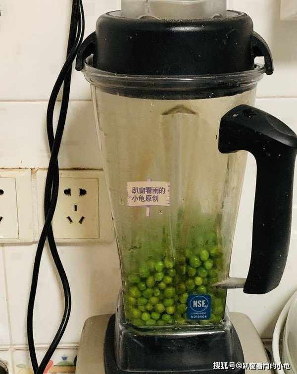 3、將過完涼水的豌豆放入攪拌機或者料理機中,再加入少量的剛煮豌豆的水,用料理機打成非常細膩的豌豆泥。 【此步註意:加水與否取決於你傢裡的攪拌機或者料理機,有時候,不加水,有的攪拌機或者料理機根本打不動。】
