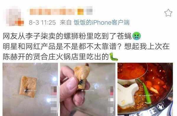 比如說李子柒,她是知名的網紅博主,年收入都上億的人瞭,因為自己視頻做的好,所以也帶火瞭一些美食,李子柒的螺絲粉就相當受吃貨們歡迎。所以李子柒還找瞭工廠將螺螄粉制成瞭快餐賣出去,可是買過的網友卻在其中發現瞭蒼蠅,這也讓網友們覺得十分的惡心,覺得明星的東西也不過如此。