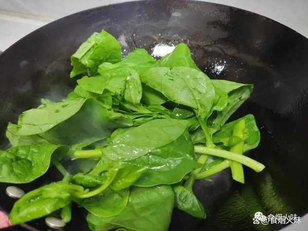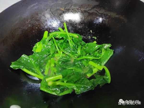 4.洗凈的木耳菜倒入鍋中,這個時候轉為大火。木耳菜特別鮮嫩,炒的過程中用大火快炒。這種菜隻有經過大火的快炒,炒出來不僅口感脆嫩,而且顏色翠綠不發黃;