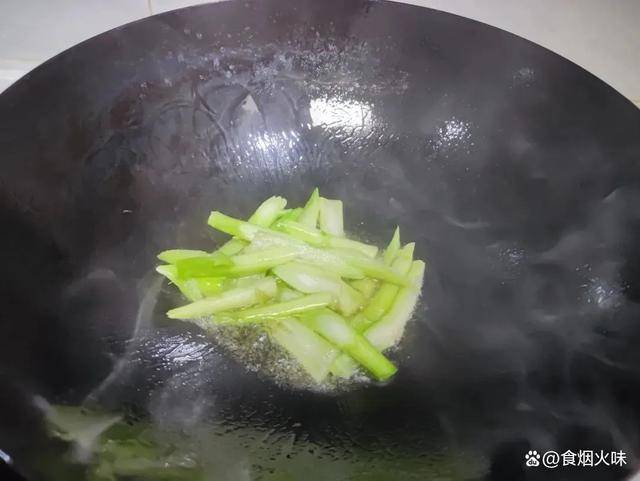 2.炒鍋中的水分幹後,倒入適量的油,鍋中的油熱後晃動鍋身,熱油潤一下鍋。等到鍋內的油冒煙後,將切好後的菜心莖先下鍋炒,炒10秒鐘,下鍋後鏟子勤翻動;