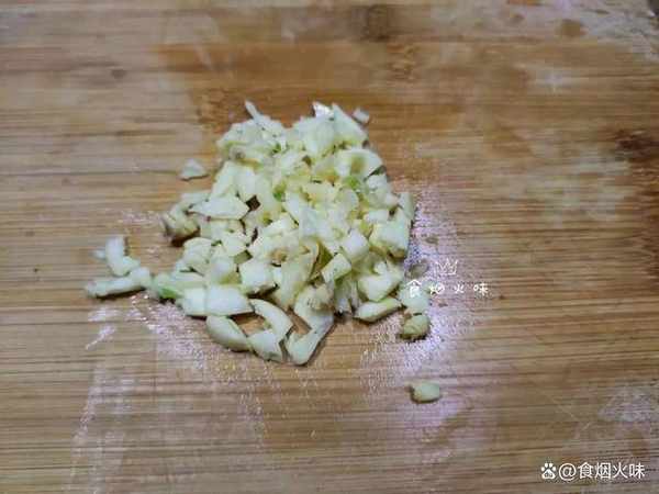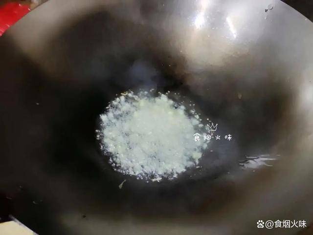 3.準備一個幹凈的鍋,鍋中的水分幹後,倒入適量的油。鍋中的油溫熱後,將準備好的蒜泥倒入油鍋中煸炒。蒜沫在熱油中煸炒出香味,炒的過程中用小火炒;