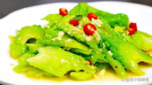 1、苦瓜一根洗凈後切開,挖去內囊,然後切成片,小米椒幾個切成圈,大蒜拍扁切成蒜末。起鍋添水,加入幾滴植物油和一勺食鹽,水燒開後,下入苦瓜片,焯水十秒鐘後撈出控水,並過一下涼水備用。