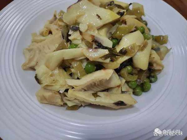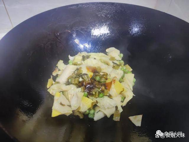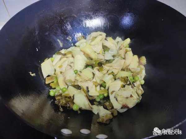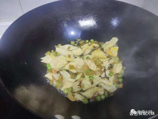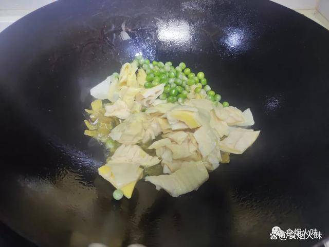 5.筍的口感清脆和豌豆粒粉糯好吃,食材下鍋,用鏟子將它們炒去,食材炒均好後加入適量的食鹽跟蠔油調味。因為酸菜的本身非常的咸,所以加入的鹽不要太多,以免太咸。