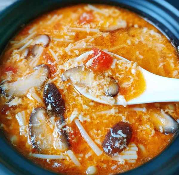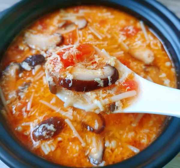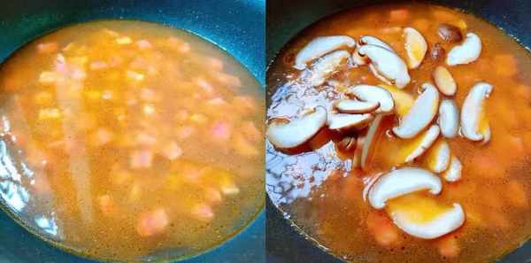 3、在鍋內調入一點生抽炒香,然後倒入飲用水煮沸。把香菇和金針菇放進去,煮兩三五分鐘。