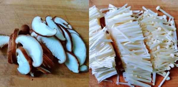 1、來準備一些菌類,香菇和金針菇,分別洗凈之後,根部都剪掉,香菇切片,金針菇改刀小段。