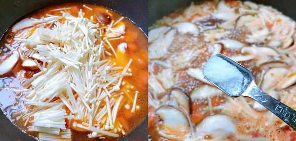 4、將香菇和金針菇的鮮味煮進湯汁中以後,調入一點鹽。