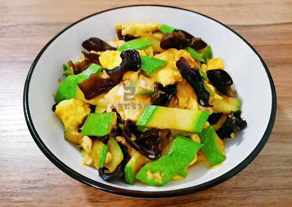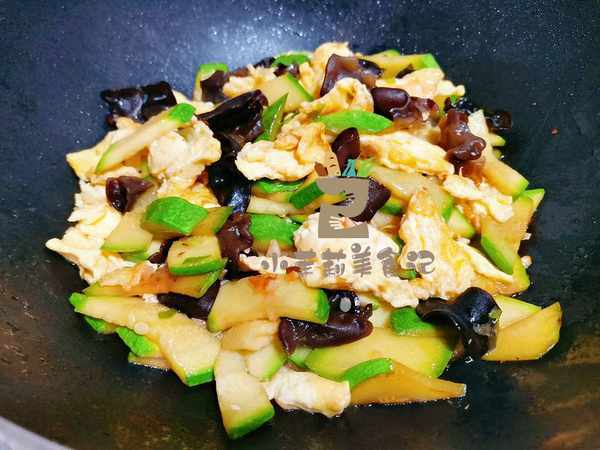 5、放一些蒜蓉進去炒幾下,別等發黃就將西葫蘆倒進去,烹入一點生抽,然後用大火來炒,西葫蘆也很容易熟,我們把木耳倒進去,再調入一點蠔油,將雞蛋再次倒進去,然後繼續快炒,不需要再另外放鹽,各種食材入味即可裝盤上桌。
