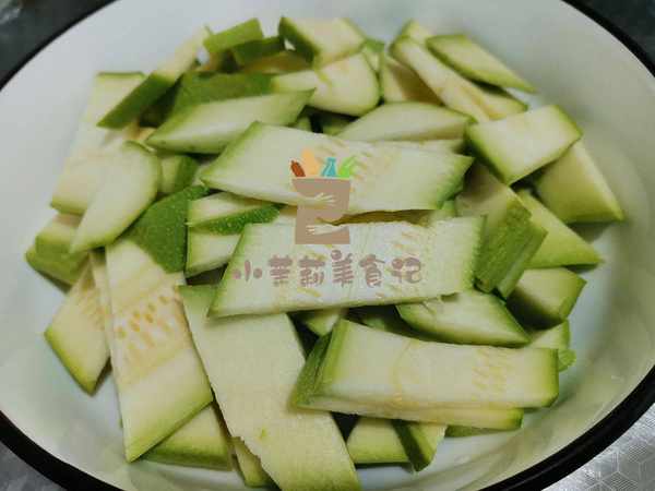 2、中等大小的西葫蘆半個,洗凈之後,切成小段,再進一步將每一個小段立住,切成片狀。