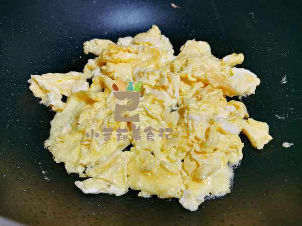4、先來炒雞蛋,起鍋燒油,在油熱之後倒進去,蛋液受熱凝固,快速翻炒形成小塊,然後盛出。