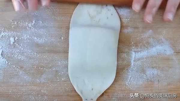 12.全部按照這個步驟做好,然後取第一個做好的面劑子。用搟面杖搟成牛舌狀即可。厚度0.2-0.3厘米左右。