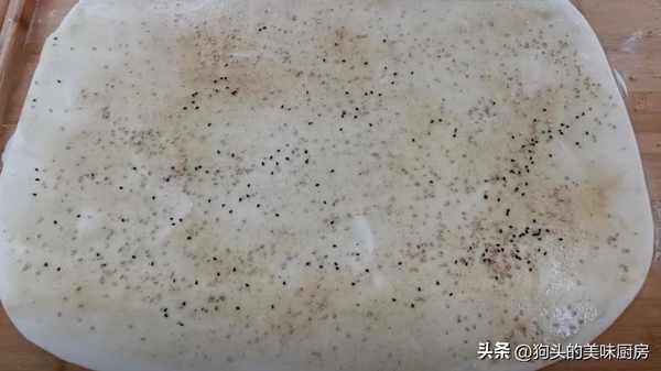 6.面團醒好之後取出來不用揉。案板上撒一點幹面粉,把它搟成長方形面片,厚度0.2-0.3厘米左右。然後在表面塗抹上一層油酥。然後撒點幹粉防粘。