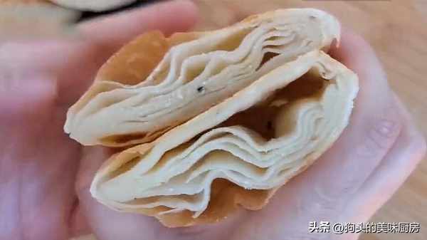 這道酥餅外形牛舌狀,有些地方喜歡做成圓餅狀,牛舌狀薄度好掌握,也更容易操作,表面顏色金黃,碰起來刷刷響,這是酥脆的聲音。一口咬下去直掉渣,可太香瞭。內部有很多層次,夾層上塗抹的是花椒油酥,風味十足。口味是淡淡的咸口,不用太咸,一點點味就夠,加上麥香味,真的是越吃越香。做這種花椒酥餅,層次豐富是一個亮點,每一層都有調料,吃著香就是這個原因。