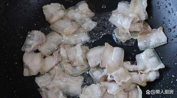 3、倒去鍋中的水,水燒幹倒一點點的油,油熱下五花肉片翻炒,炒至肥肉變透明,再將肉片放一邊,下蒜片和幹辣椒炒香,再放蒜和辣椒、一勺豆瓣醬,翻炒出油。