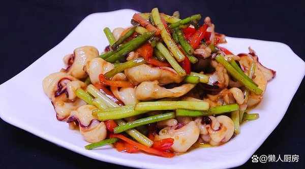 5、鍋中倒去水,燒幹加油,油熱放入蒜末和生薑末炒香,先放入蒜苔和紅椒翻炒,炒一會兒,就放入章魚片翻炒,倒一勺生抽,一勺醋,一點鹽和雞精調味,翻炒均勻,就可以出鍋瞭。(手法不成熟的人,可以提前把調料先準備好,這樣不會炒的時候手忙腳亂)