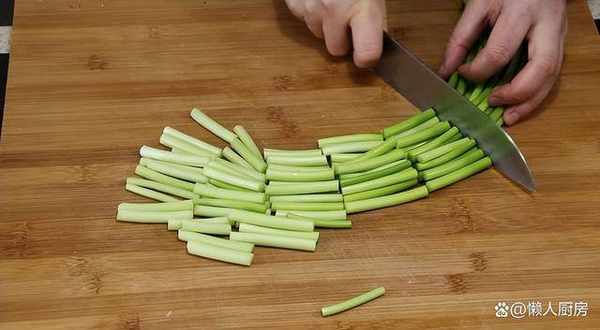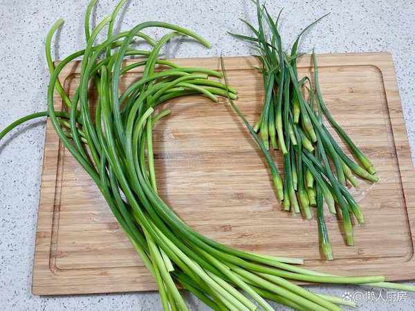 做法:1、蒜苔洗幹凈切成段;為瞭好看,選擇一個紅椒作為搭配,切成紅椒絲;生薑、大蒜切成末。
