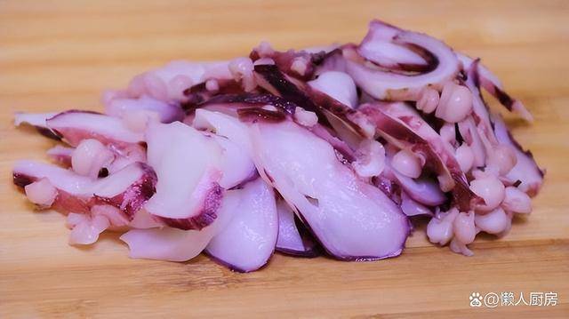 4、鍋中的水不要倒去,放入章魚焯水,放一點料酒去腥,時間也控制在十秒左右,撈出就可以瞭。
