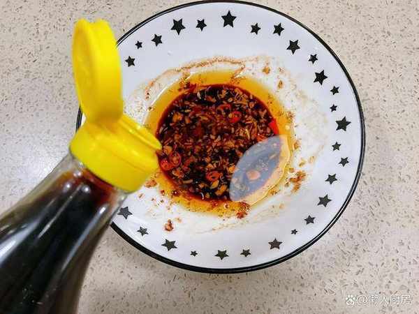 3、調一個料汁,碗中放入小米辣和蒜末,加適量的生抽、鹽、糖、好吃的醬料,拌勻,可用熱油激發一下香味。