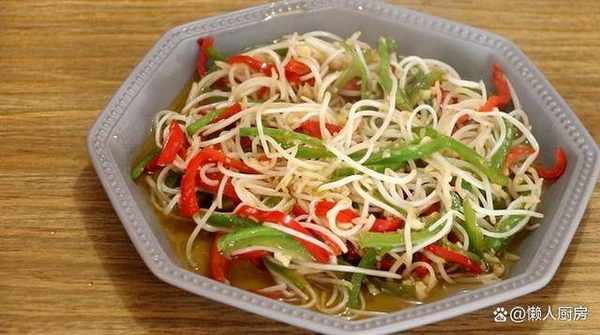 4、放入青椒絲和紅椒絲翻炒,炒稍稍軟之後,放入豆芽爆炒。炒至所有食材變軟,放入適量的鹽調味,即可關火盛出。