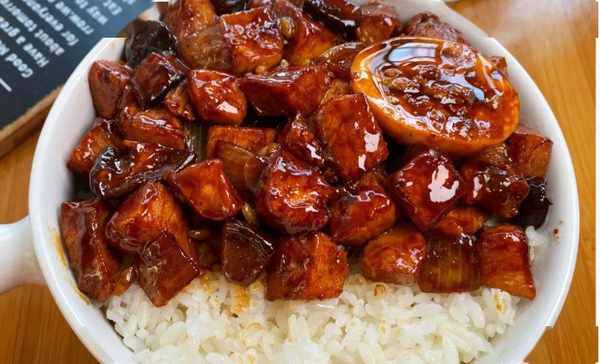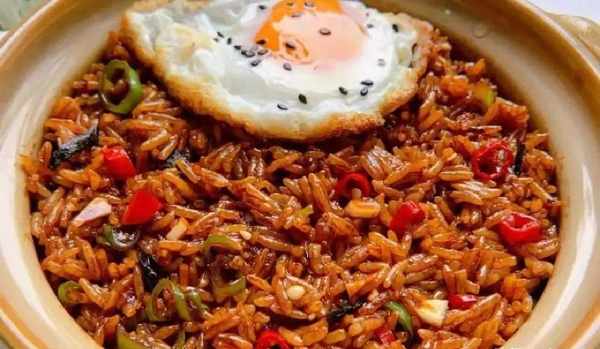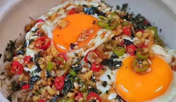 2:煎一個雞蛋,煮熟的米飯放入碗中,放雞蛋,倒入醬汁,放海苔肉松,拌勻即可享用。