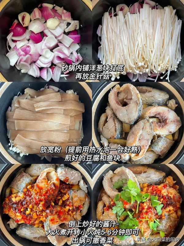砂鍋底部碼上洋蔥打底,再鋪一層金針菇,加入火鍋苕粉,最後將煎好的鱸魚和豆腐塊碼在上面,加入炒好的醬汁,再加入適量的清水,大火煮開後轉小火燉5分鐘左右即可,最後在撒上點香菜段即可開吃!