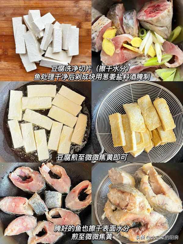 首先我們將買回來的鱸魚清洗幹凈後加蔥薑鹽料酒進行醃制,豆腐切成小塊後下油鍋炸至兩面金黃,醃好的魚用廚房紙吸幹表面水分煎至微微焦黃備用!