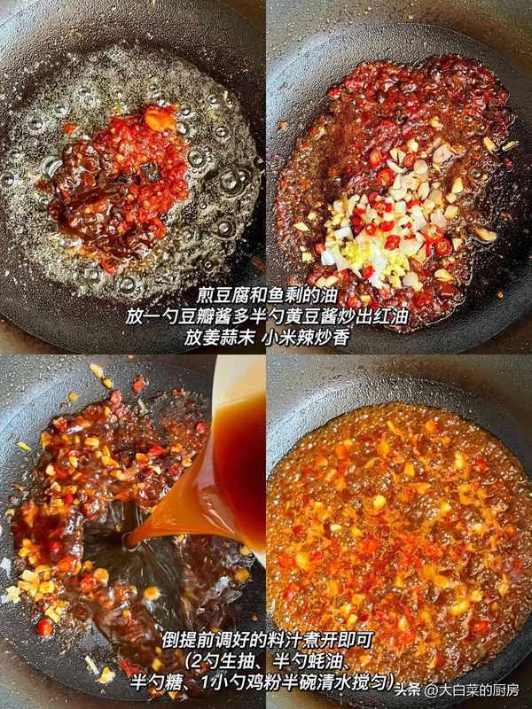 用鍋裡剩下的油一勺豆瓣醬半勺黃豆醬翻炒出香味,加入薑蒜沫和小米辣炒香,加入調好的料汁,比例如下圖所示: