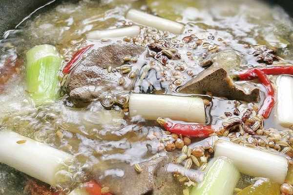 用料:花椒2克,八角3克,香葉2克,小茴香3克,桂皮2克,幹辣椒1克,黃酒1湯勺,大蔥1根,老薑1塊,鹽適量。