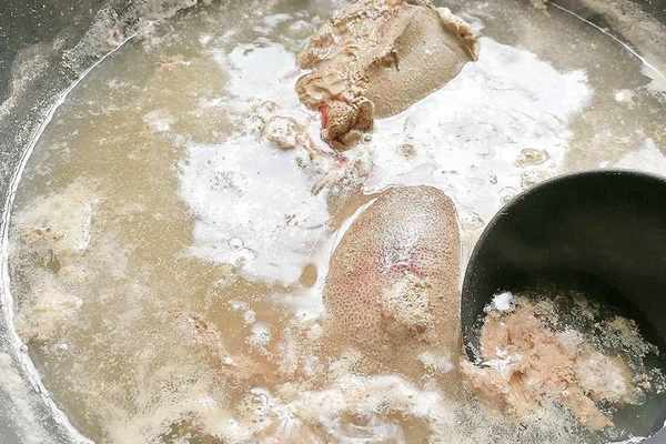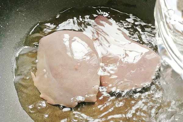 第三步,煮到豬肝不再往出冒血絲,說明豬肝也已經變熟瞭,如果不放心可以掰開一塊看裡面是否熟透,再決定要不要接著煮,煮好後撈出豬肝清洗瀝幹。豬肝比較嫩,很容易煮老,在整個煮的過程中要一直保持中小火,煮出來的血沫要及時地撇幹凈。