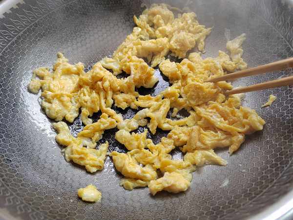 2、雞蛋加入料酒打散,倒入熱油中,煎至成型後劃散,盛出。