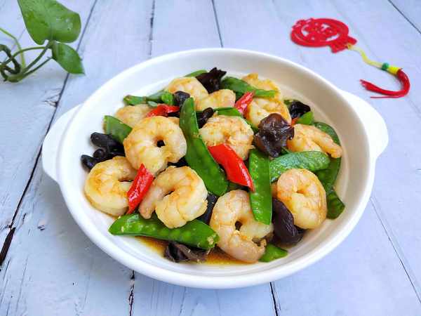 食材:蝦仁、荷蘭豆、木耳、油鹽、蛋清、生粉、生抽、蠔油、料酒、紅辣椒。