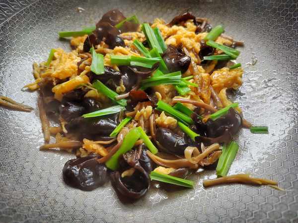 3、放入黃花菜和木耳爆炒片刻,再放入雞蛋混合,最後加入鹽、生抽、蒜苗炒勻即可。