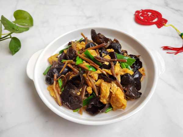 食材:黃花菜、木耳、雞蛋、油鹽、生抽、料酒、蒜苗。
